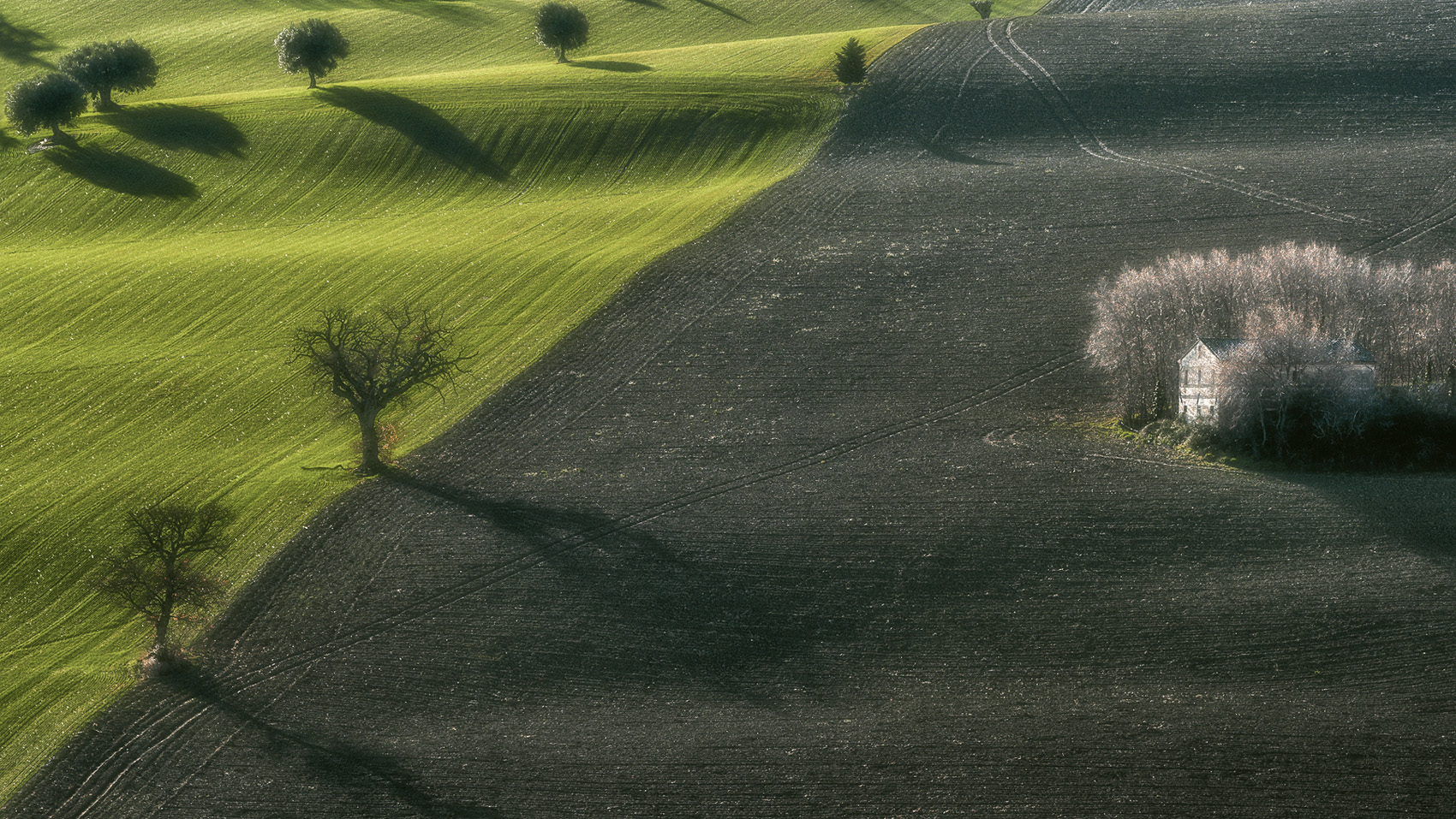 A me questa immagine piace moltissimo… Trovo molto bella la suddivisione netta del frame tra il campo in germoglio e quello ancora brullo, avvincenti gli alberi chiari sul campo scuro e scuri sul campo chiaro e fantastiche le onde del terreno con la luce radente… In quanto ai tagli, avrei forse tagliato ancora un po’ a dx, al limite del casolare, e avrei cercato di evitare (anche clonando) quelli delle ombre in alto, ma l’immagine è e rimane ottima… tant’è che la stellizzo