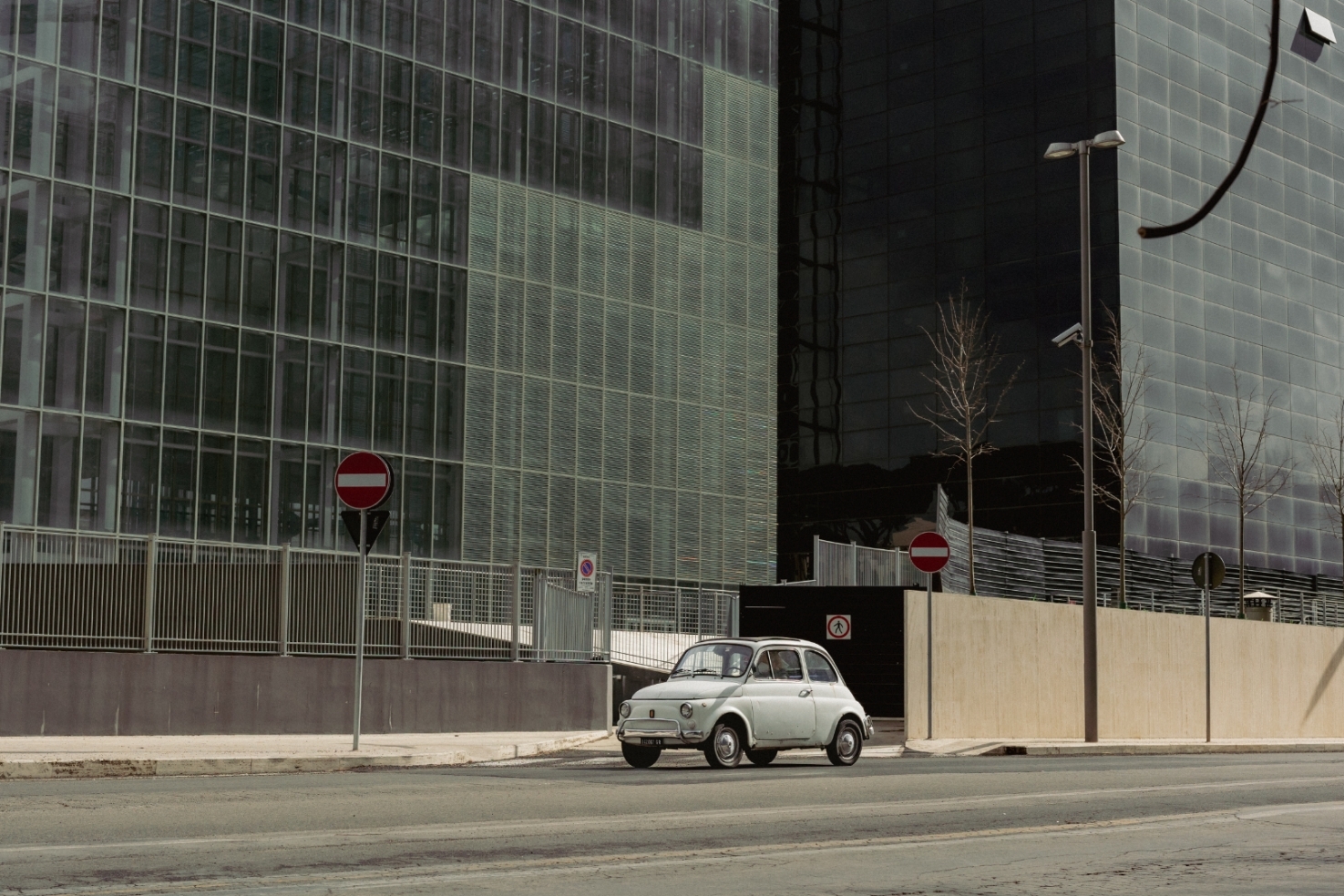 Una buona composizione che coniuga bene tutti gli elementi geometrici con l'auto che ne determina la rottura. Purtroppo la conducente, che nell'altra proposta caratterizza la ripresa e le dona quel quid, qui non è così determinante.