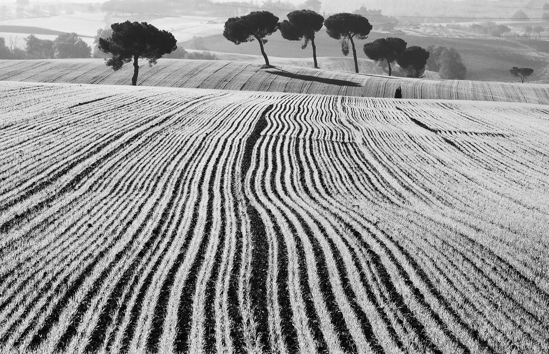 Anche per me questa immagine e migliore della precedente, l'occhio ci porta subito ad osservare il primo piano dei solchi con quei pini su terreno ondeggiante, ben ripresi, gradevole anche questo b/n.