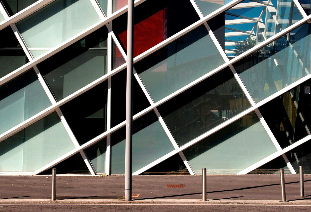Le belle geometrie, la buona luce e i colori vivaci ne fanno una gradevole immagine Trovo valida la presenza di pali e paletti a bilanciare l’architettura obliqua