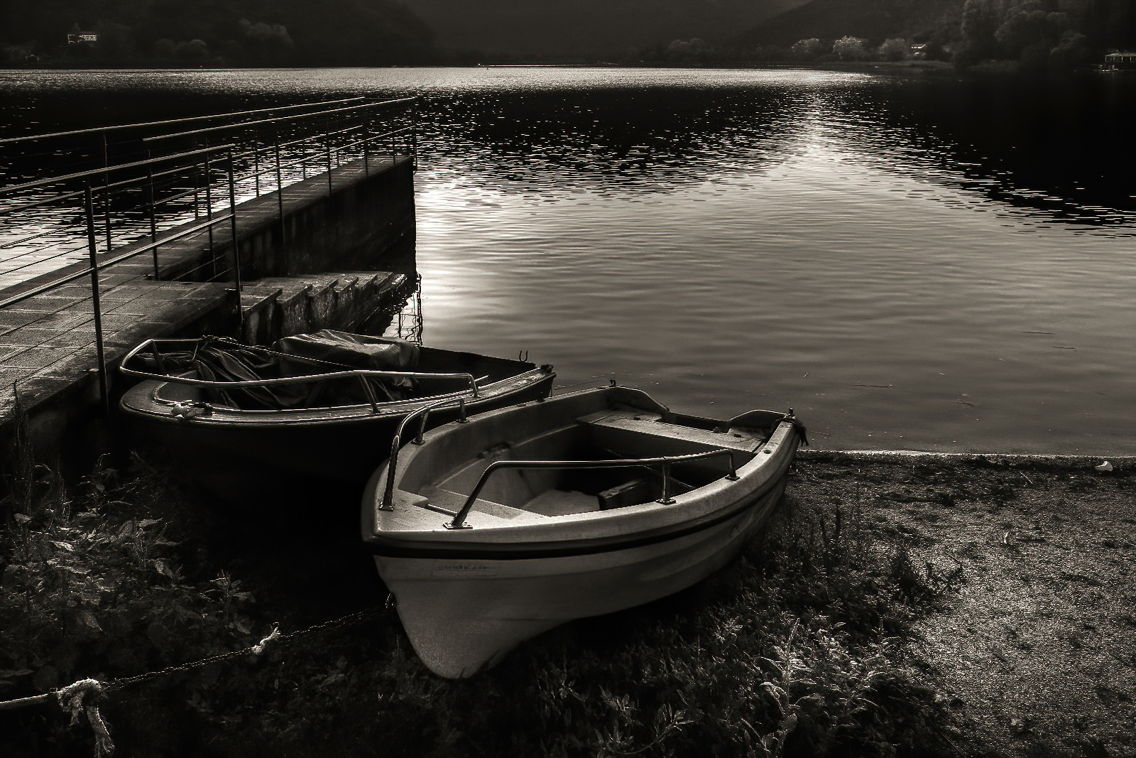 Un bel bianco e nero dai toni caldi. Bella la composizione con le due barche in primo piano che occupano gran parte del fotogramma e ne diventano co-protagoniste al pari del bel riflesso di luce a piramide sulle acque. Bella. Ciao, Tiziano  |