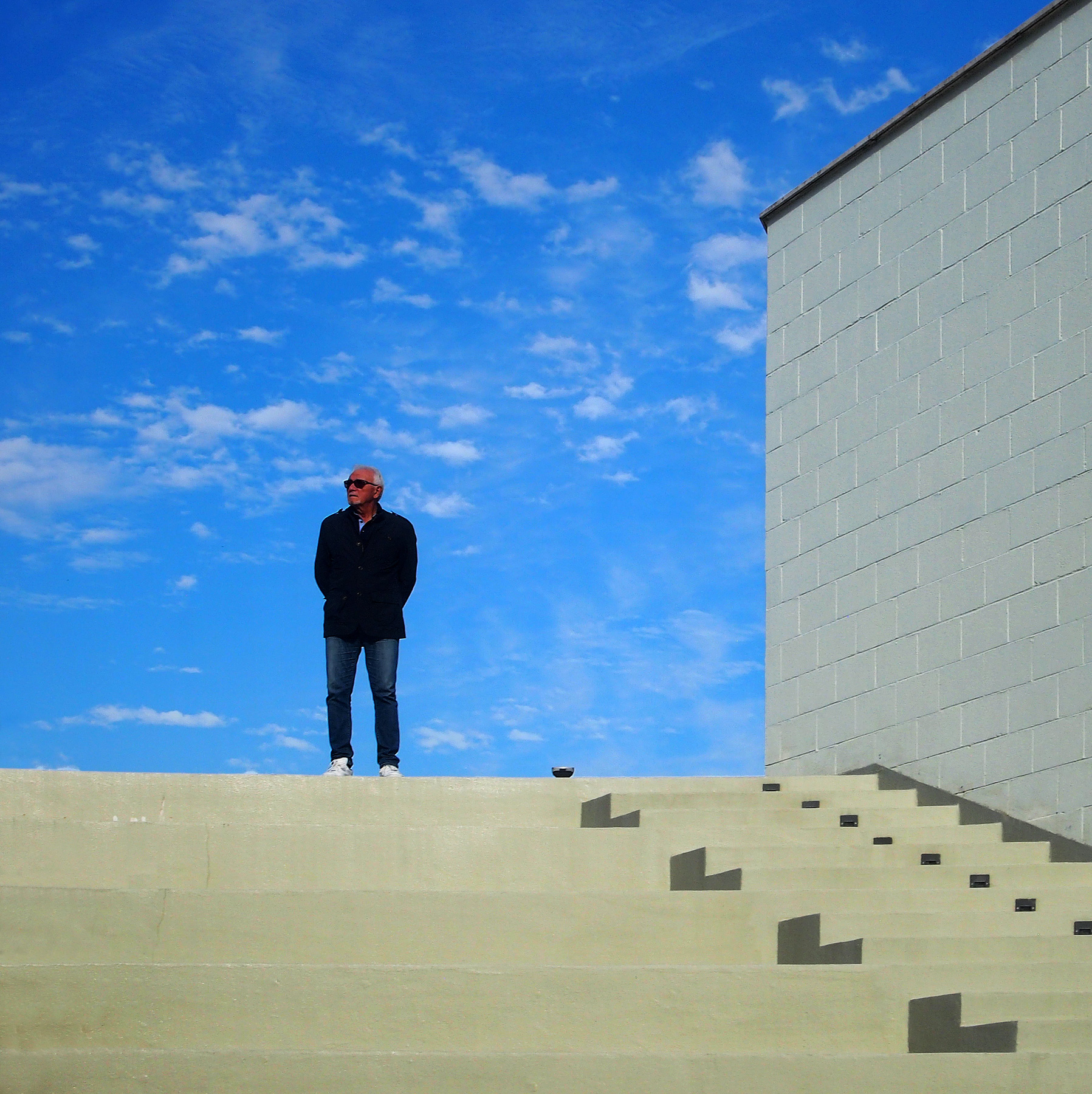 Uno scatto che mi ricorda un po De Chirico. Ottima la costruzione dell'immagine con le geometrie che disegnano un cubo, dove due lati sono occupati dalle geometrie del muro e delle scale e, altri due lati dal cielo dinamico (per via delle nuvole) in cui si staglia l'uomo. Per me ottimo scatto