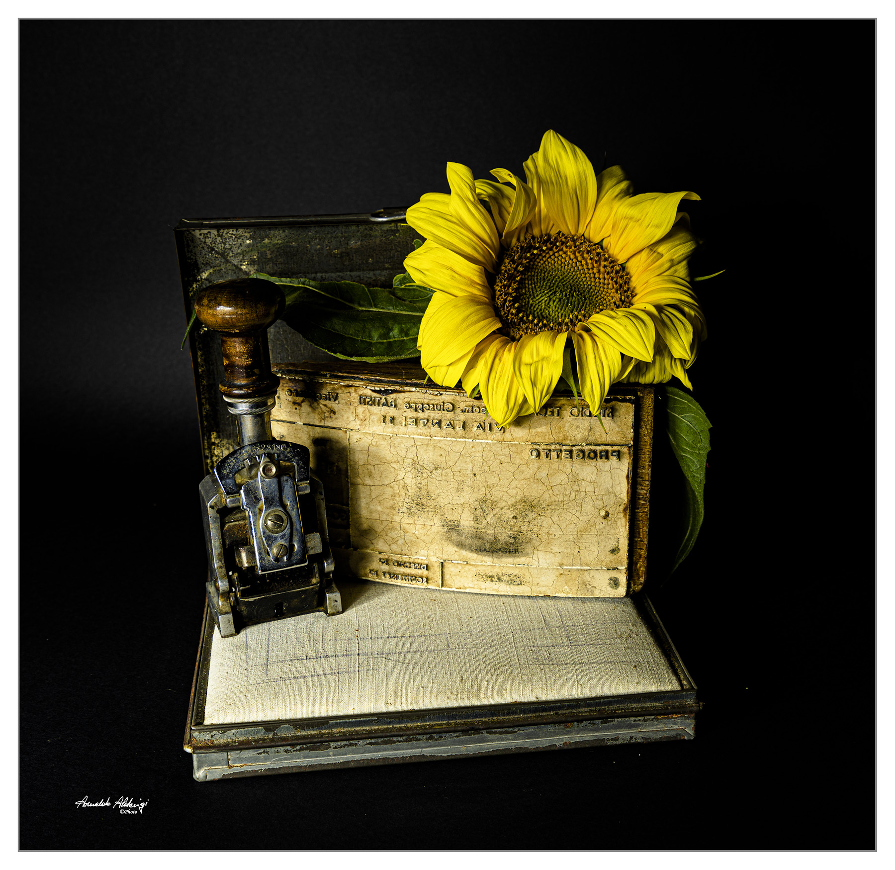 | Bella questa foto di still life dove anche il girasole che comincia un po' ad appassire sposa bene il senso vetusto del timbro e del suo tempo passato. Intensa la resa del colore. ;i piace. Ciao, Tiziano |