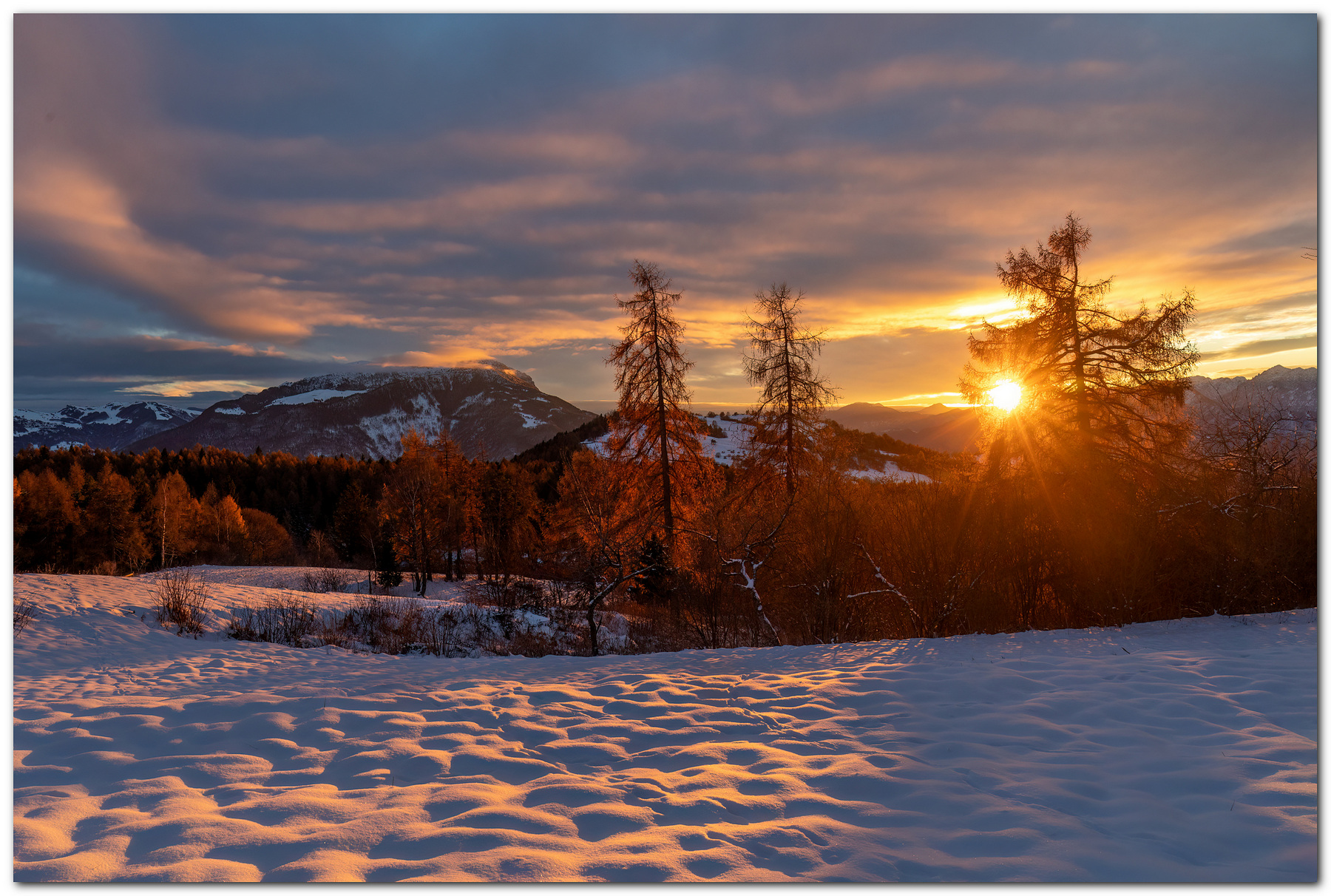 Che meraviglia... l'incontro tra caldo e freddo, il sole che saluta inondando di accoglienti sfumature aranciate il mondo ... Ottima la composizione, l'effetto stella sul sole che è un valore aggiunto. Onde sulla neve e onde sulle nuvole ..insomma bella bella  _________________