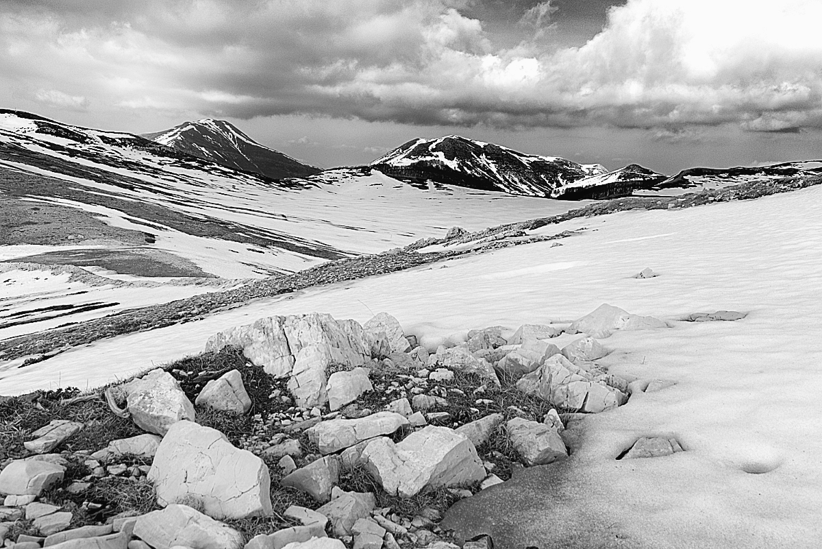 Bel paesaggio montano parzialmente imbiancato d'inverno, impreziosito dalle nuvole e dal funzionale primo piano roccioso. Trovo ben fatta la versione in bianco e nero, che preferisco a quella colorata. Ciao, Francesco