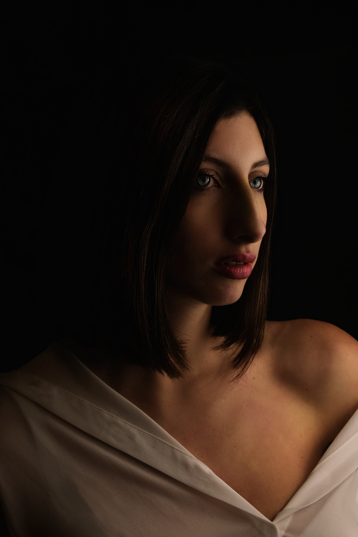 Ciao, non mi convince molto né l'illuminazione né il taglio. Mi spiego: a sin. la forte e ampia zona d'ombra fa perdere dettaglio e volume ai capelli e quella sul volto dà ancor più risalto ad un naso importante ( che avrei cercato di ammorbidire). A dx il taglio scelto tronca la morbida curva della spalla sbilanciando anche la simmetria che poteva derivare dalla V della camicia. Personalmente poi trovo l'iride troppo lavorata ( perde in naturalezza). Secondo me.