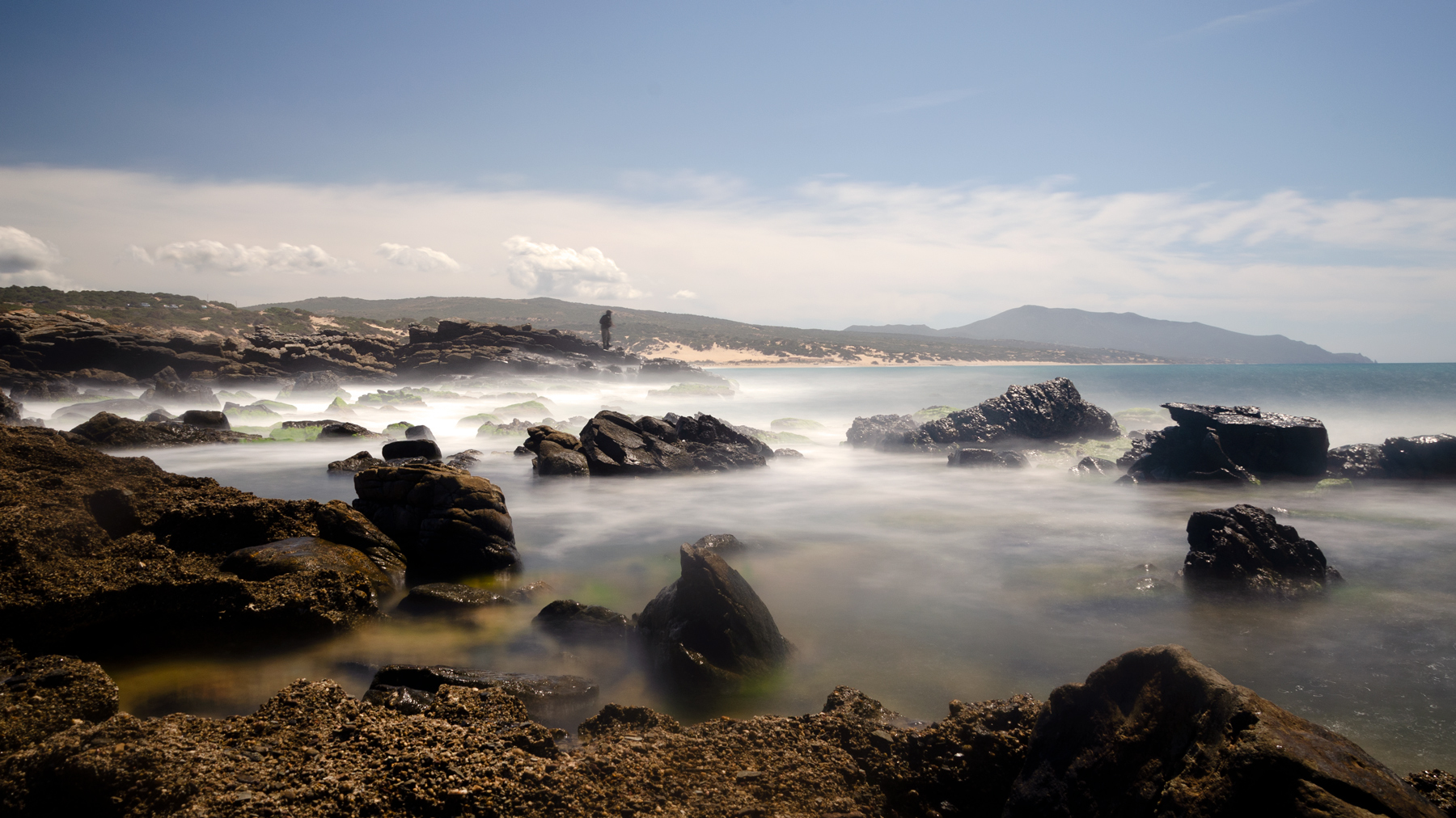 Molto bella e suggestiva questa location ripresa con buona tecnica e con una resa ottica davvero buona che ci trasporta direttamente sul luogo a sentire il suono dello sciacquettare spumoso delle onde che si infiltrano fra le pietre frastagliate della costa. La figura, lontana ma non troppo, da una esatta misura delle distanza e riempie attivamente la scena innescando un elemento dinamico nel contesto di una rappresentazione piuttosto idilliaca.