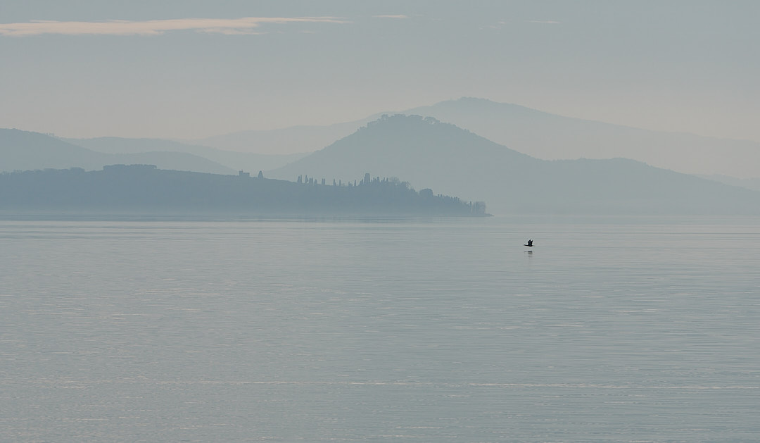 Etera e delicata. Tutto questo celestino nebbiosetto rotto dalla sagoma nera del cormorano a filo d'acqua.