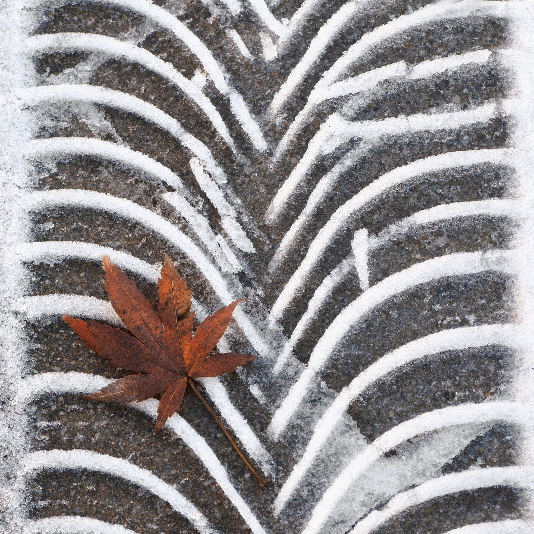 una traccia lasciata da un trattore credo che sembra un dipinto con l'aggiunta della foglia a impreziosire l'immagine e dare un tocco di colore, ottimo lavoro.