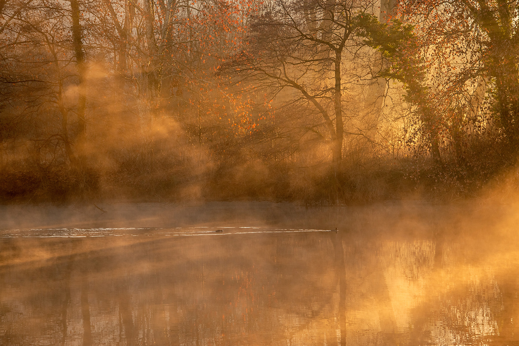 Bella la luce, bella la foschia, belle le scie nell'acqua dei volatili, bella la compo.