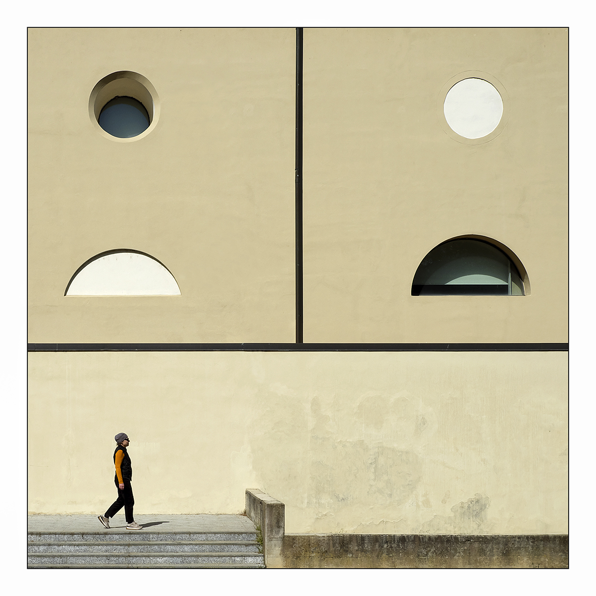 L'alternanza di finestre a oblò e mezzelune aperte e cieche unita alla presenza discreta del pedone con una piacevole dominante cromatica su scarto di toni rende l'immagine molto piacevole e curiosa. Per me uno scatto interessante e ben visto.