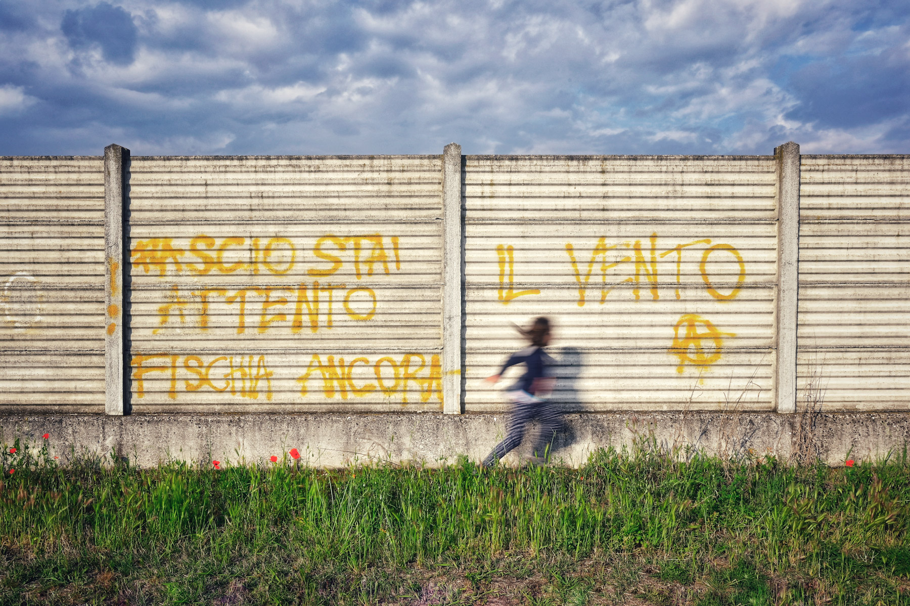 | Ottima la corsa "mossa" del ragazzo o ragazza . L'immagine con la scritta si trasforma in un poster social politico contemporaneo che ha il sapore di una copertina da album di canzoni giovanili e impegnate. Mi piace. Ciao, Tiziano |