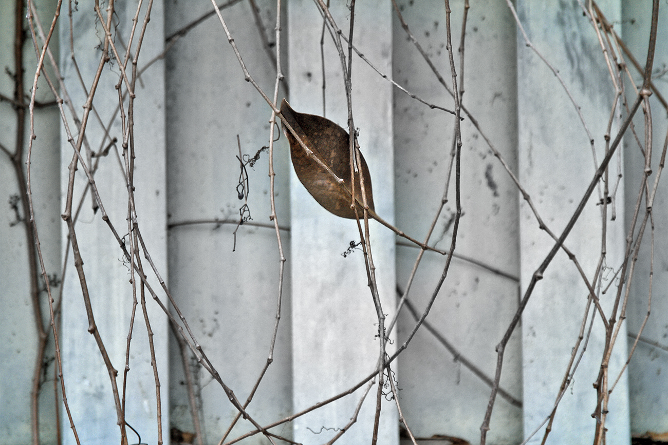 Una foglia prigioniera tra un esile intreccio di rami e le leggere canne tubolari.