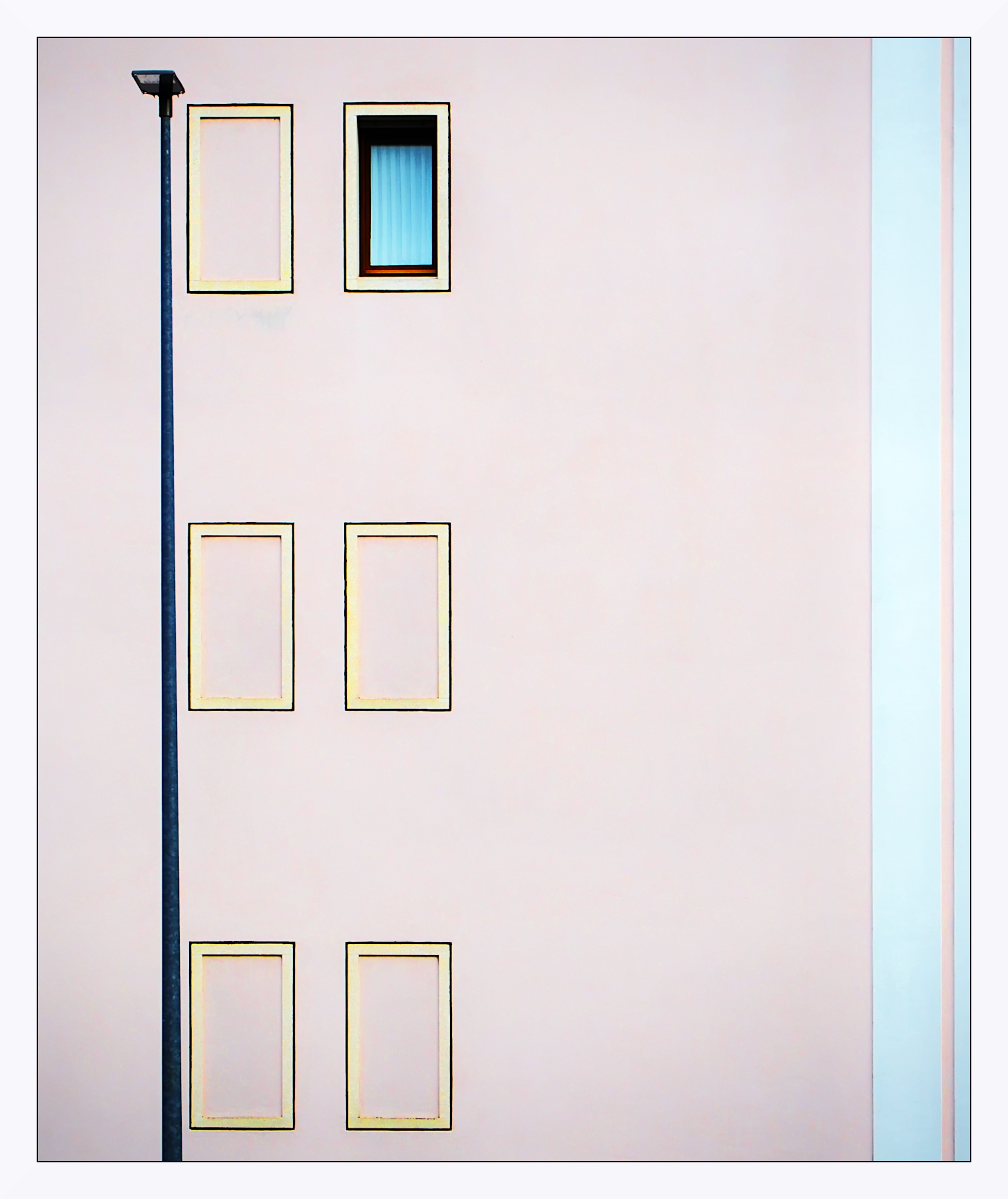 Colori pastello tenui e gradevoli, finestre incise graficamente sul muro, lampione in ottima posizione nel frame come le fasce di chiusura sulla destra.