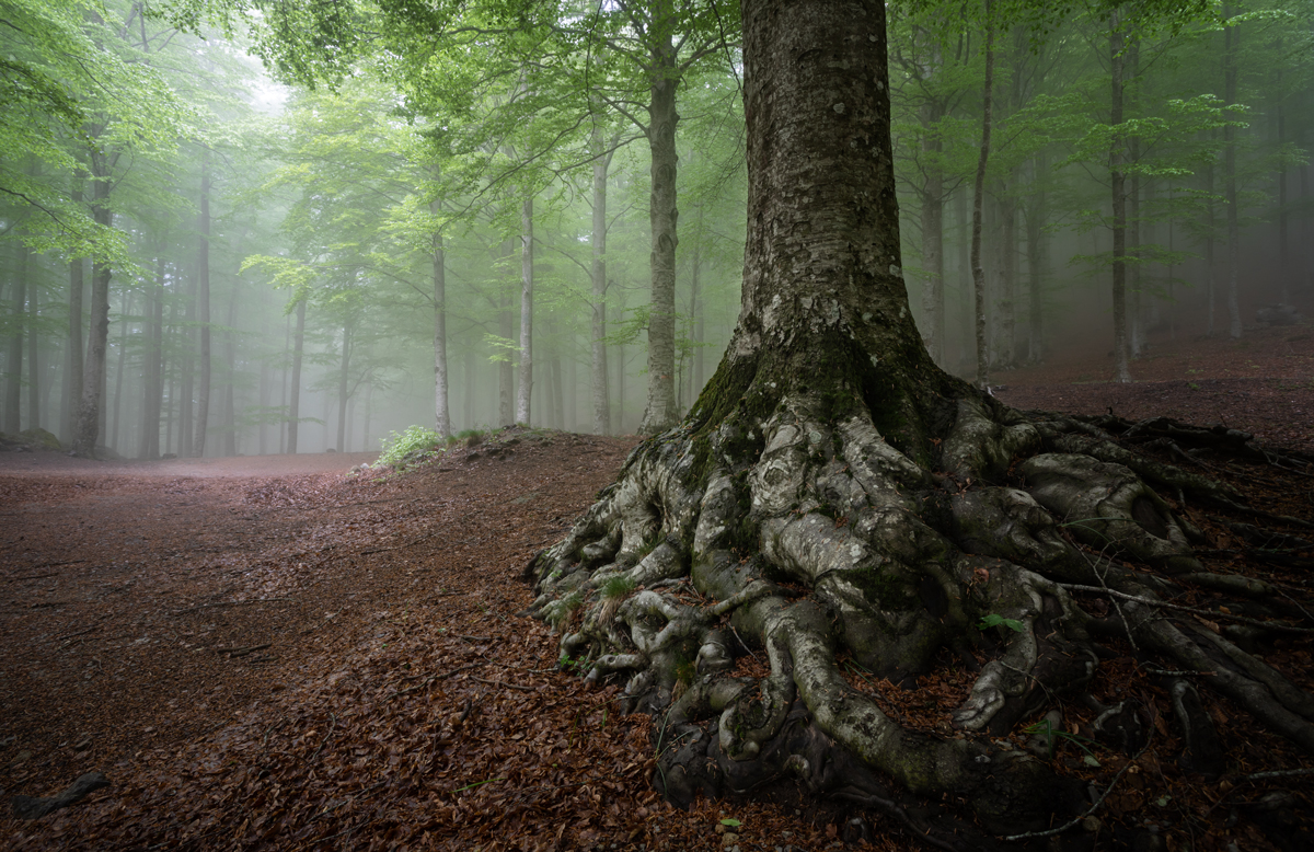 le radici di questo albero, maestoso come da titolo,(un faggio?) ci introducono nel bosco avvolto dalla nebbiolina che crea un'atmosfera ricca di fascino. Mi piace molto