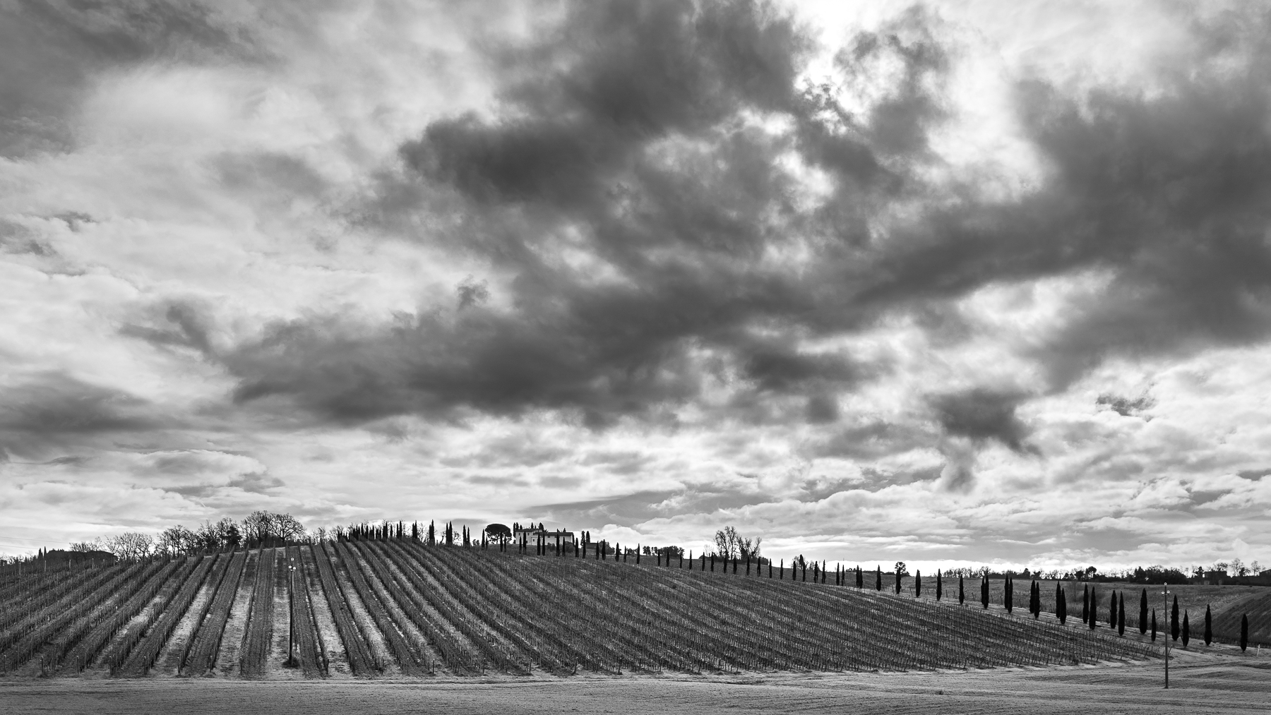 Poca terra, tanto cielo. Bello il gioco di linee del vigneto e dei cipressi che lo delimitano.