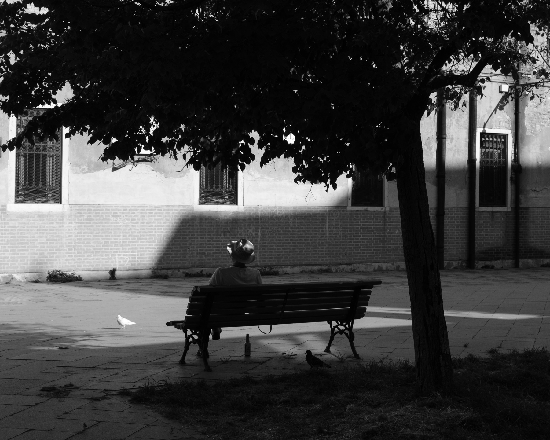 Ottima compensazione luce-ombra in questo scatto malinconico che ci parla di solitudine (i piccioni,la bottiglia) e di mancanza di prospettive (lo sguardo sul muro).Immagine da leggere lentamente per coglierne in pieno l'atmosfera.Bella! Ciao,Sergio. _________________ Sergio Demitri https://www.flickr.com/photos/124946035@N02/ |