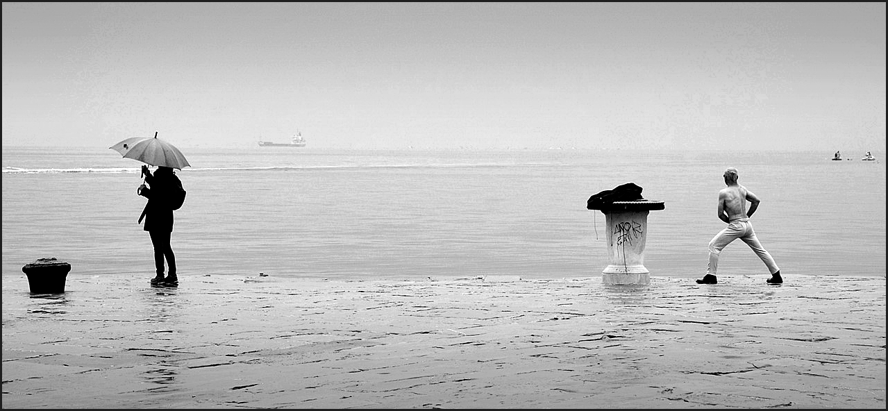Audace il molo e audace l'atletico uomo che sfida le intemperie.