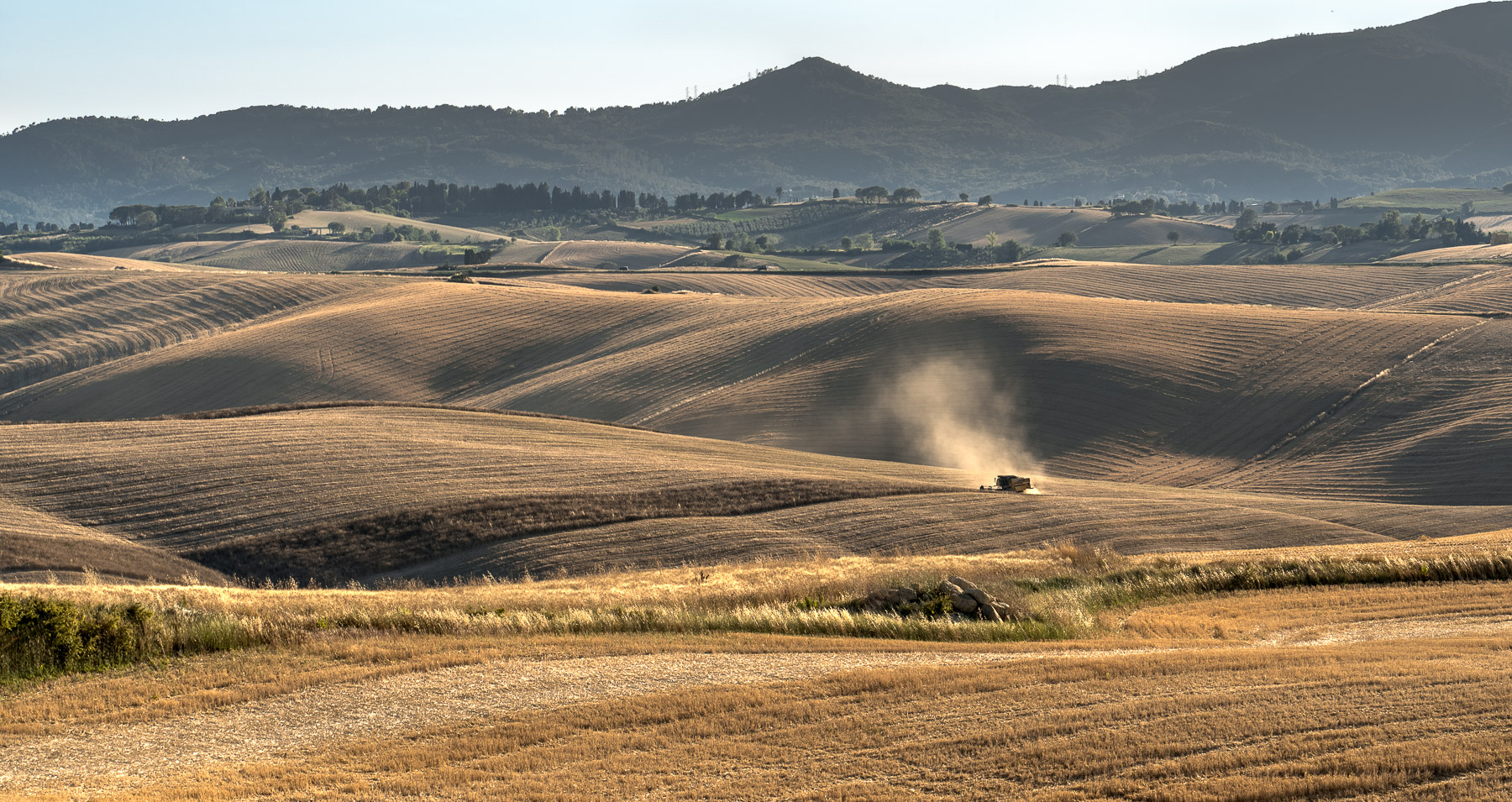 Il polverone della trebbiatrice casca perfettamente sullo sfondo in ombra e "fa" la foto.