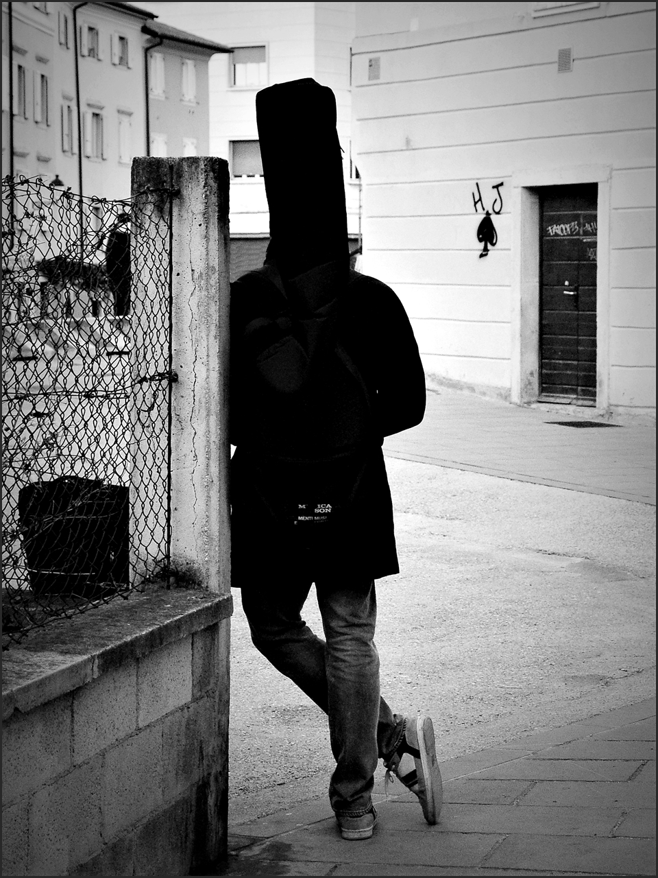 Insolita ripresa ma ben attraente. Lo zaino porta chitarra rende il profilo della persona molto singolare. Efficace anche il bianco e nero. Ciao, Francesco