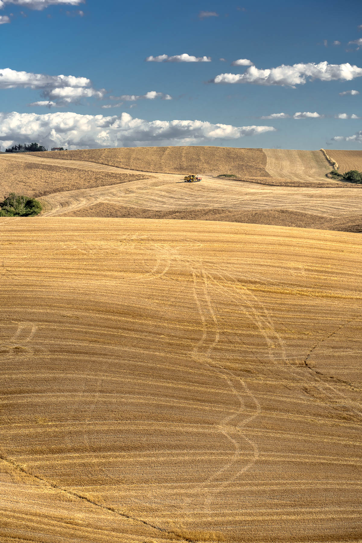 Mi piacciono le proporzioni con una giusta porzione di cielo e tanto spazio dedicato ai campi dorati decorati dalle linee lasciate dagli attrezzi agricoli. In alto la mietitrebbia che da un riferimento alle proporzioni del paesaggio ripreso