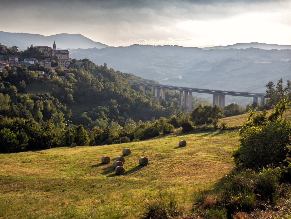 Il panorama che proponi è visivamente accattivante, apprezzo molto come hai saputo sfruttare a tuo vantaggio gli elementi del paesaggio che avevi di fronte, che presi singolarmente potrebbero non essere troppo fotogenici, come il viadotto, oppure banali, come le rotoballe, ma che nel complesso formano un insieme gradevole e ben armonizzato, fa ovviamente eccezione il pittoresco borgo Appenninico.