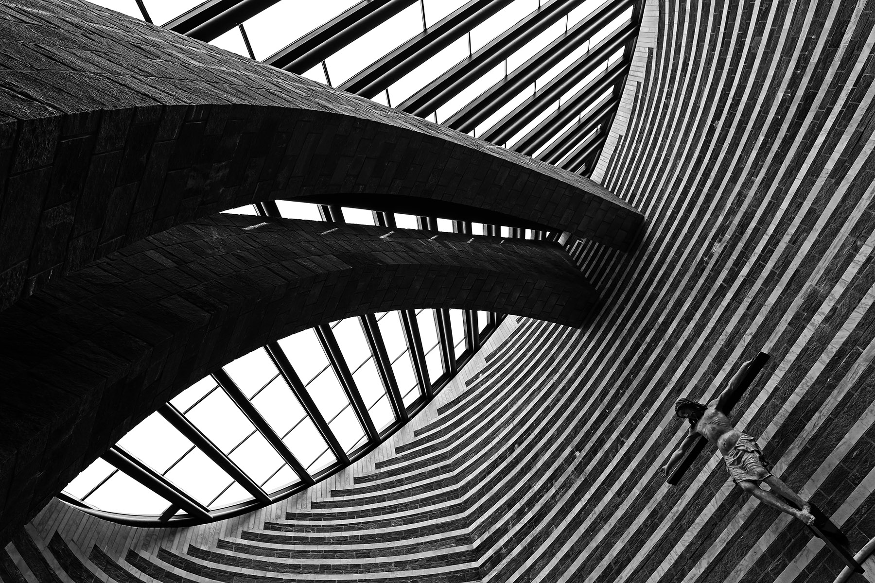 Un’angolazione vorticosa e sicuramente avvolgente e coinvolgente Ok! Buona la posizione del crocefisso, che si contrappone all’imponenza delle travi, forse avrei schiarito un po’ i grigi per enfatizzare di più le linee della parete Smile