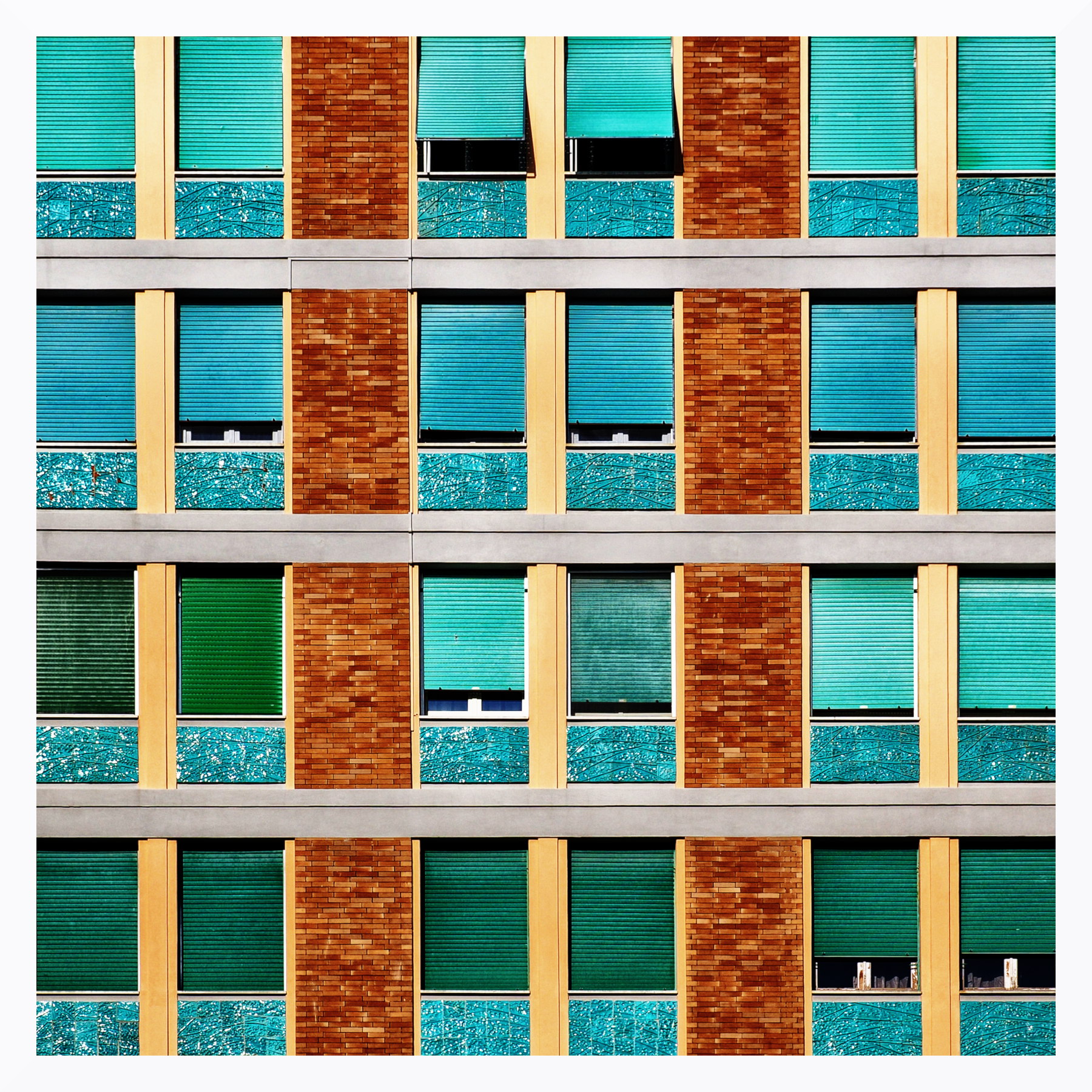 Un condominio allegro con le tapparelle di diverse gradazioni di verde e celeste.