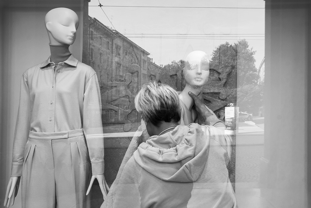 Il manichino in piedi rimane paralizzato dalla "violenza" posta in essere dalla manesca commessa.