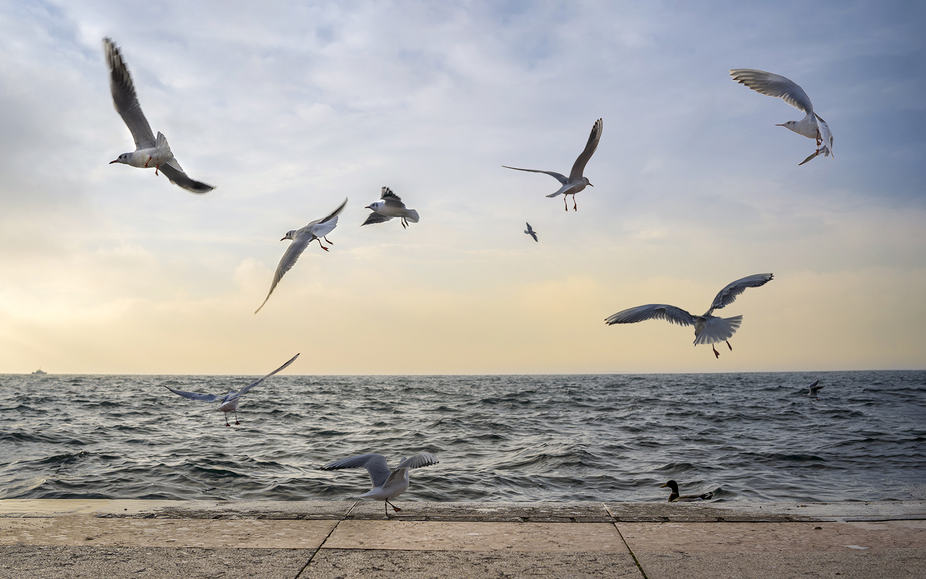 Sembra un campionario delle posizioni di volo del gabbiano. Un studio insomma. Davvero difficile trovare in uno scatto unico una varietà simile e poi senza sovrapposizioni fra l'uno e l'altro e anzi in bella armonia, un'armonia che riempe bene e idealmente il fotogramma fra cielo e mare.