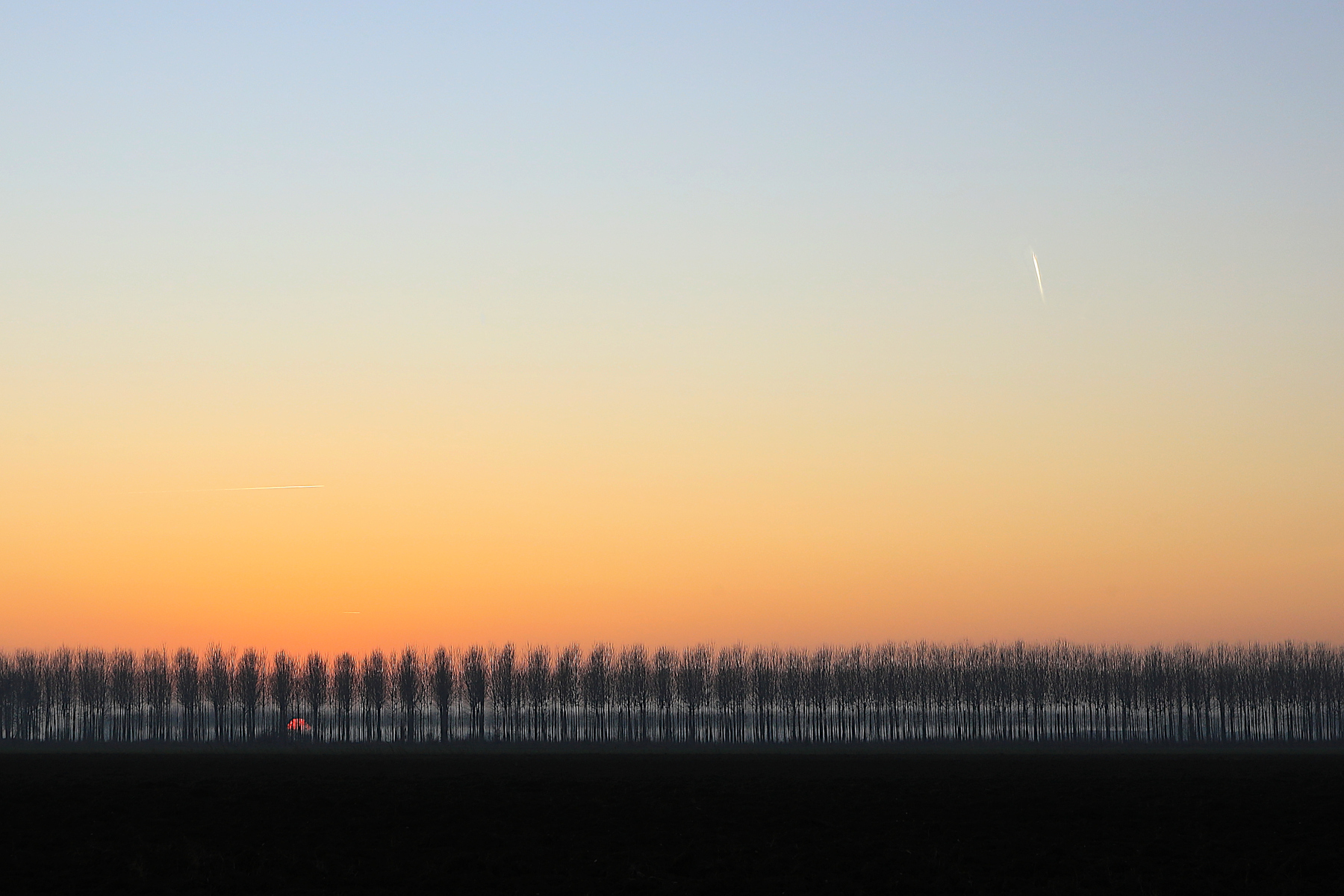 Un "niente" che adoro. Una atmosfera affascinante data dal digradare dei colori del cielo, dalla fila "danzante" degli alberi, dal sorgere del sole, che se fosse stato posto al centro sarebbe stato ancora meglio, dalla striscia nera del terreno senza la quale lo scatto si apprezzerebbe meno.