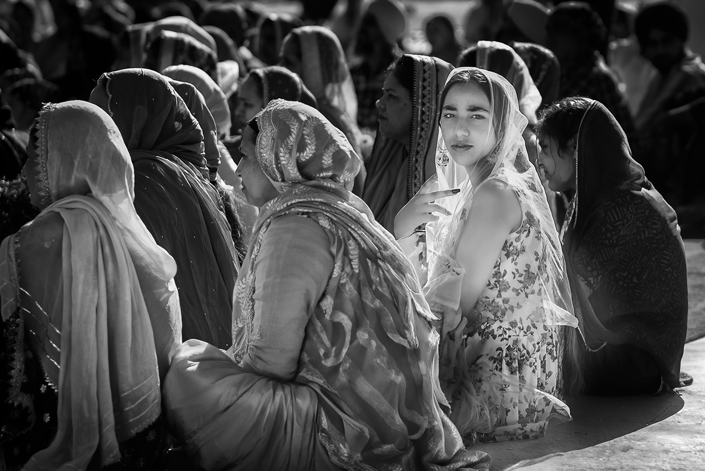 Unica persona voltata, sguardo in camera e per giunta abigliata diversamente dalle altre. Direi che i presupposti sono molto buoni. Non so se il B/W sia stata la scelta migliore, sarei curioso di vedere i colori ma in ogni caso mi sembra una gran bella proposta. Un caro saluto