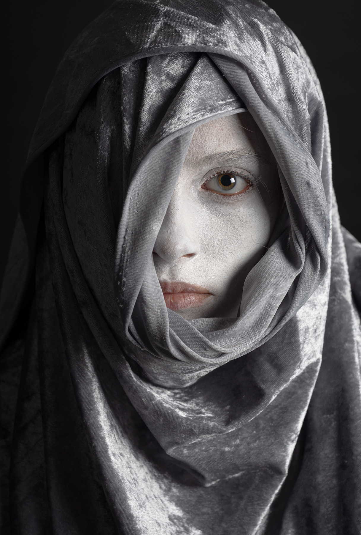 Uno sguardo intenso e penetrante, che si sporigiona dall'elaborato panneggio.