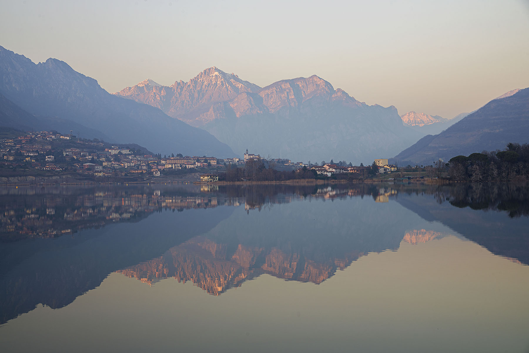Bellissimo panorama lacustre con montagne e borgo specchiati ottimamente, luce calda e tenue che ammalia.
