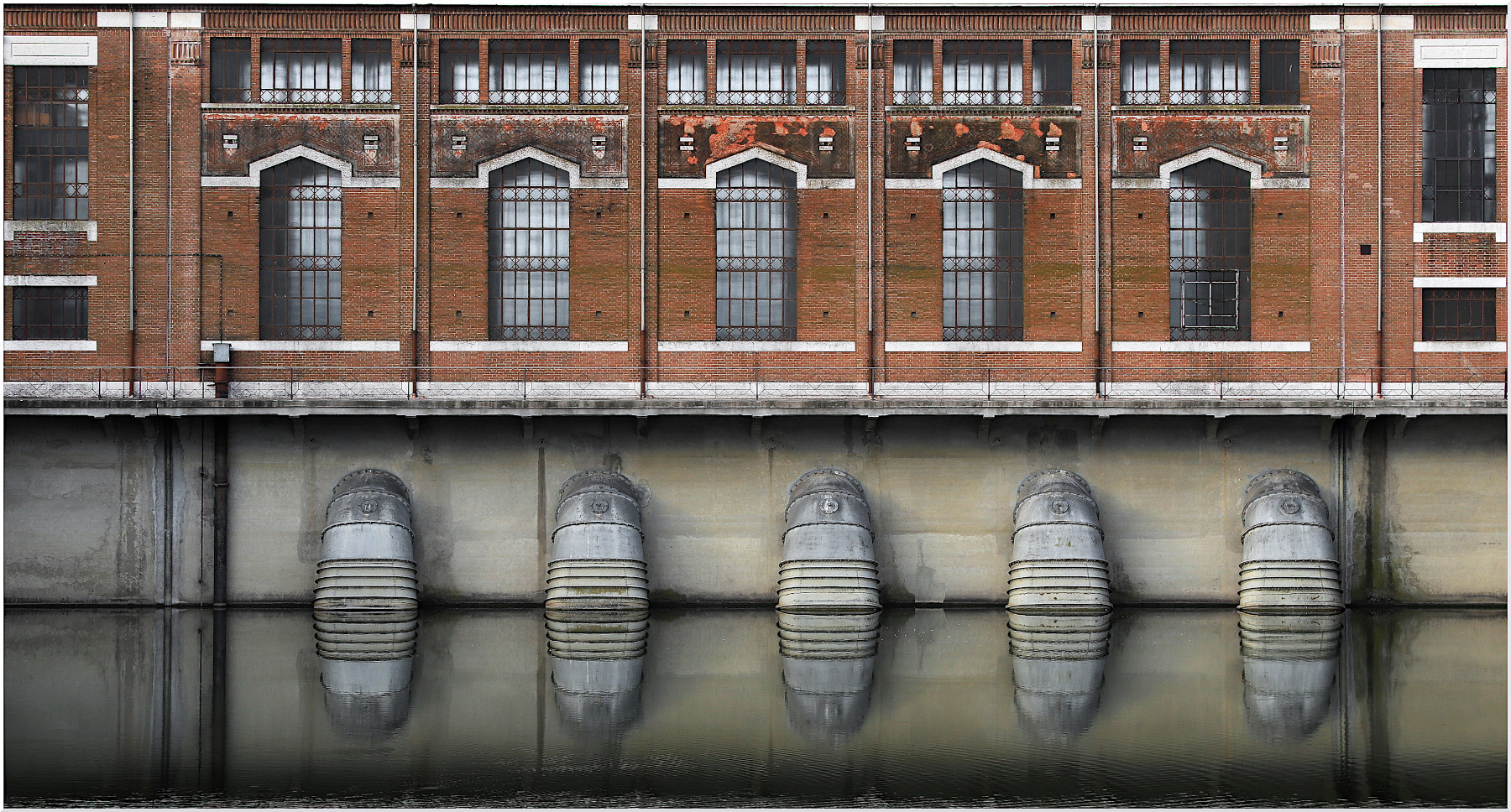 Mi piace la simmetria, la suddivisione dell'immagine, gli elementi che si riflettono nell'acqua, il ritmo delle finestre e dei tubi, il dettaglio delle finestre.