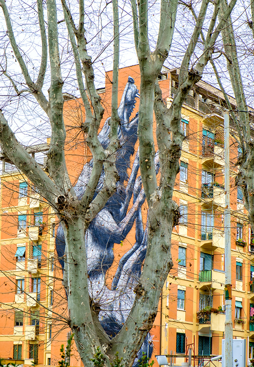 Mi piace questo enorme murale e l'idea di incastrarlo tra le branche dell'albero secondo me è azzeccata.