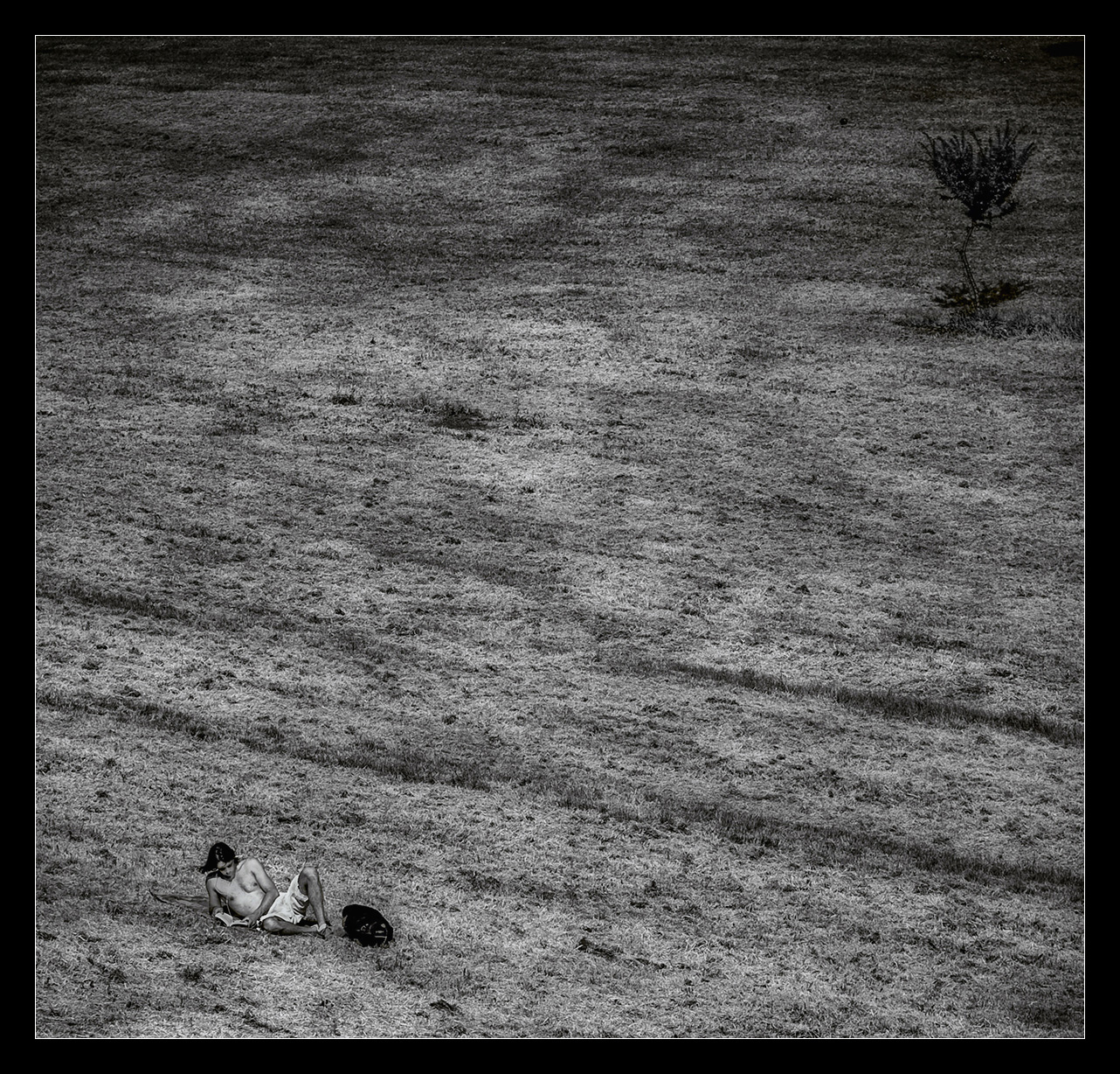 Originale questo inserimento della figura umana nel paesaggio campestre, con una composizione che la contrappone con una diagonale perfetta all'arbusto.