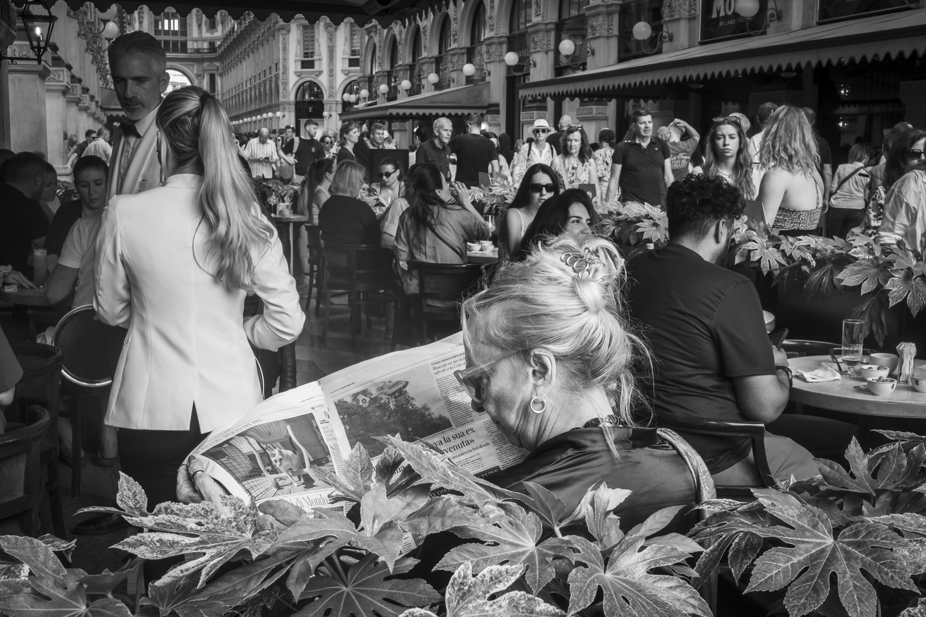 Un'immagine diversa sul giornale avrebbe focalizzato maggiormente l'attenzione. A livello compositivo avrei eliminato lo spazio tra i camerieri e il bordo. Bn sempre molto bello. _________________