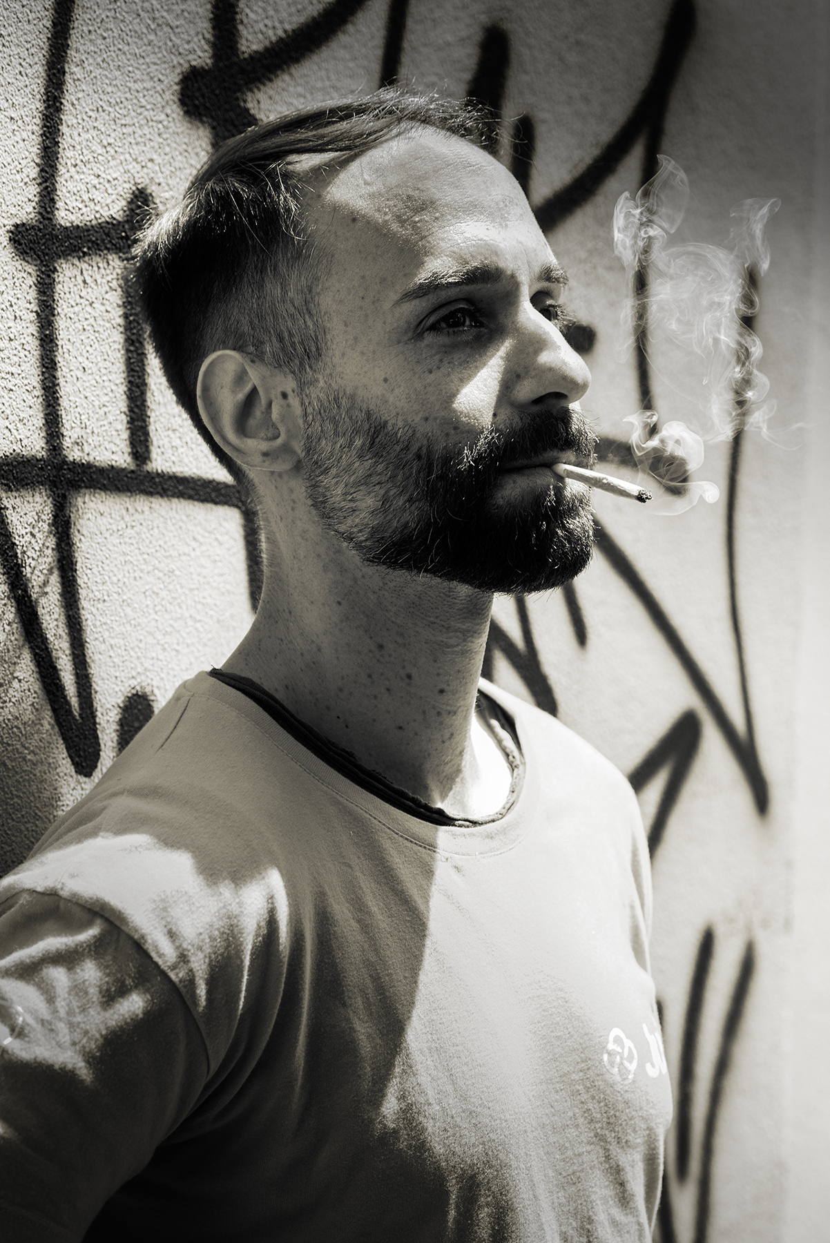 Un ritratto che ha il suo perchè! Lui ha una bella espressività e comunicatività nella mimica facciale e nello sguardo e tu hai ben saputo valorizzarla, lo dimostra il fatto che lui emerge tra una molteplicità di elementi interessanti, il fumo, i graffiti i giochi di luce e ombre. Forse l'avrei preferita un po' più ampia sai? Però mi piace  _________________
