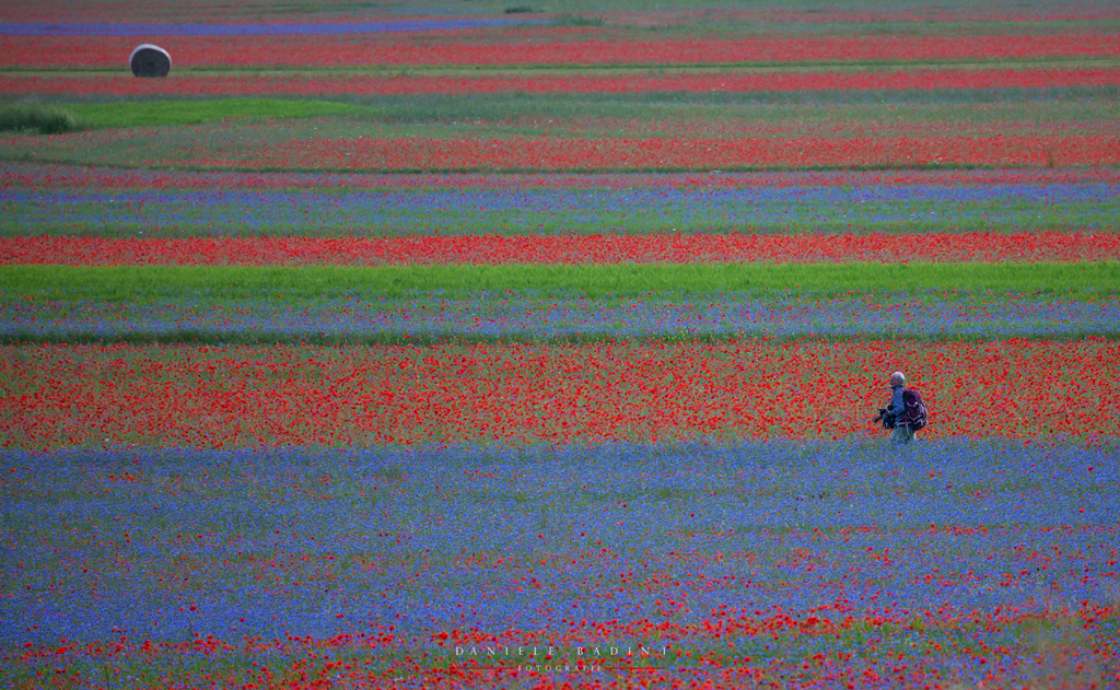 Molto bella con questa sequenza di colori. Il fotografo e la rotoballa hanno il loro perché ed arricchiscono la composizione. Forse un mezzo punto in più di luce non guasterebbe.