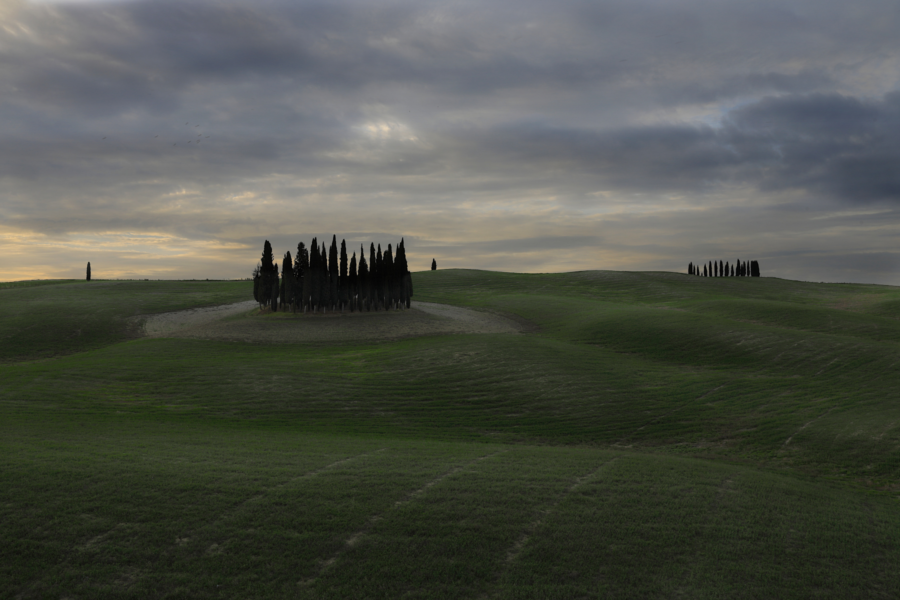 Molto bene le ondulazioni del terreno che conducono lo sguardo al gruppo di cipressi e poi fino allo sfondo.