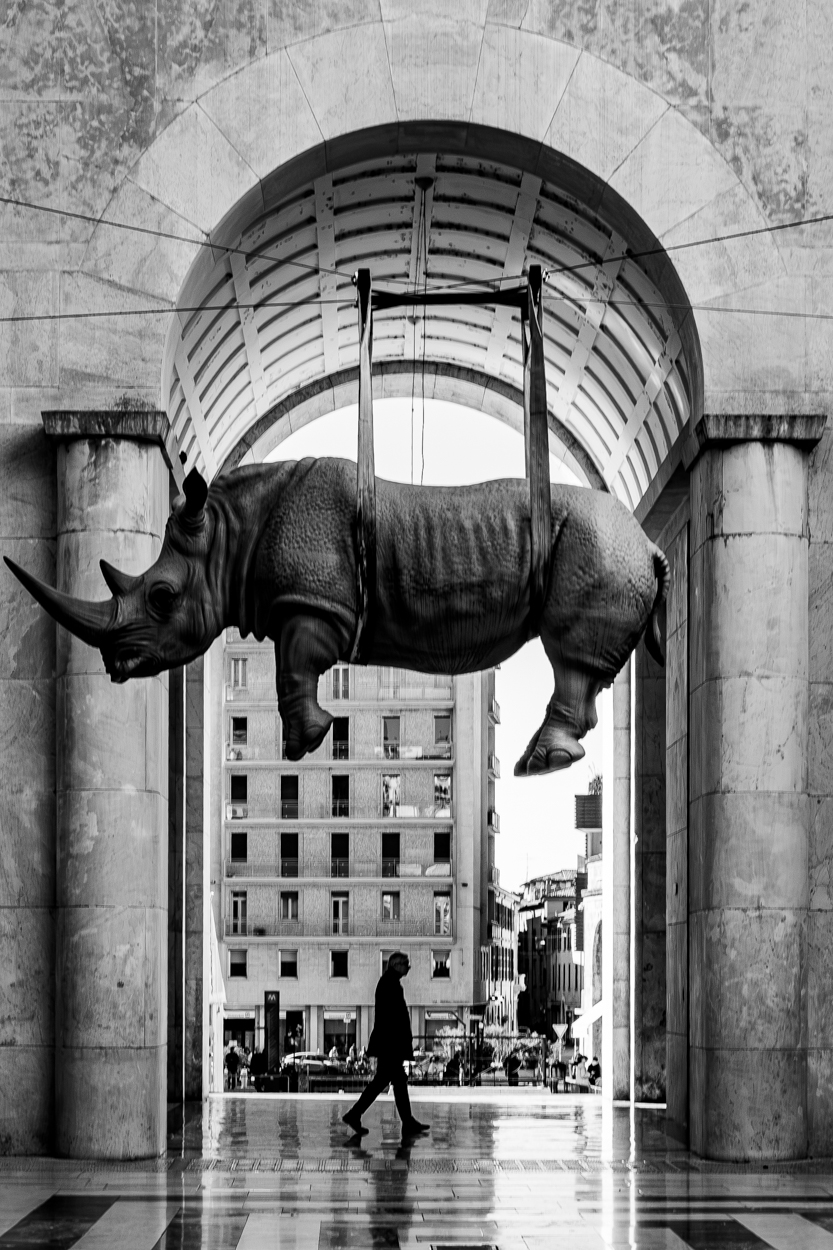 Uno scatto che sa di ironico, colpisce la massa del rinoceronte rapportato all'uomo che indifferente gli passa sotto.