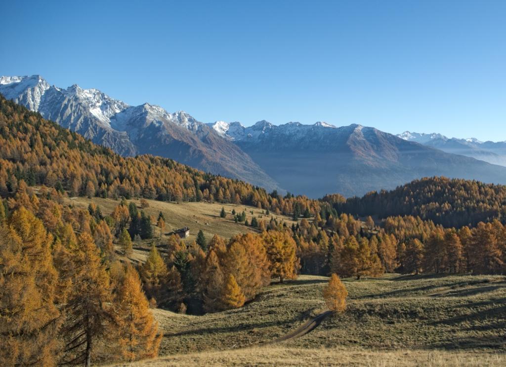 L'inquadratura è piacevole con un bel contrasto tra i colori caldi dell'autunno e le cime innevate delle montagne.