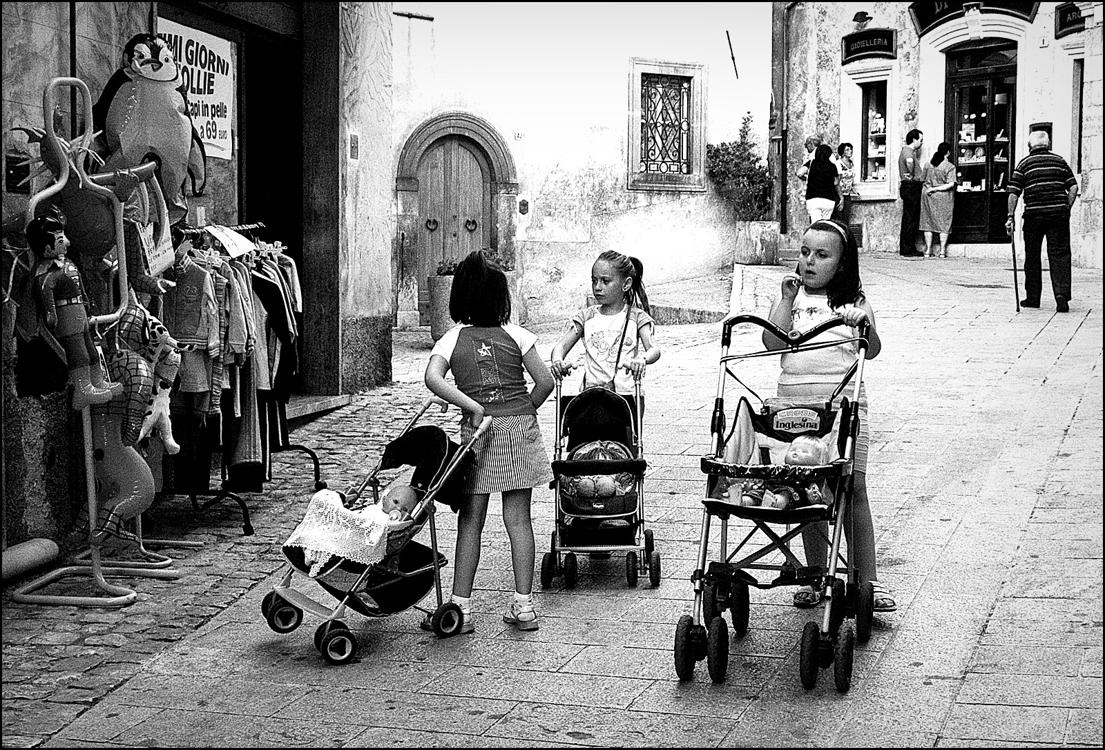 Il momento colto è eccellente e non solo per i bambini che giocano ad imitare i grandi ma anche perchè gli adulti confinati sullo sfondo segnano una separazione tra infanzia e età adulta.