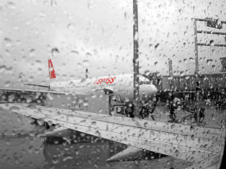 A me è piaciuta l'atmosfera strana, quasi mistica al momento dello scatto, la pioggia sul finestrino, l'assenza di colori che c'era in quel momento contrastata dalle scritte rosse dell'aereo svizzero, tutto avvolto in un alone di mistero tipico della partenza, non sai dove vai e cosa troverai all'arrivo. Il pw che ho usato ha solo accentuato quello che avevo visto e provato al momento dello scatto.