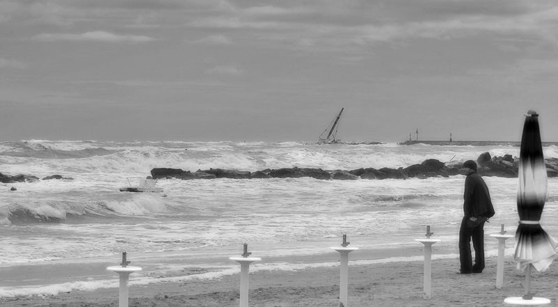Giugno 2006 costa adriatica, arriva il maltempo e mi precipito sulla battigia. Con grande stupore non sono solo, trovo questo ragazzo che immobile scruta e si lascia "flagellare" come me da schiuma, acqua, vento e sabbia.