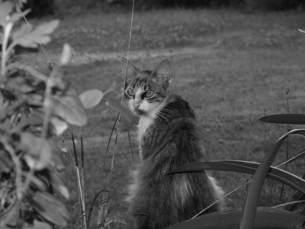 Non trovo il nesso tra il titolo e il bel gattino. Il b&n andava contrastato un pò di più, sicuramente. Le foglie e gli arbusti in primo piano disturbano un pò troppo, soprattutto quelli a destra perchè a fuoco. Inoltre, in linea di massima, è da evitare il soggetto posto al centro.