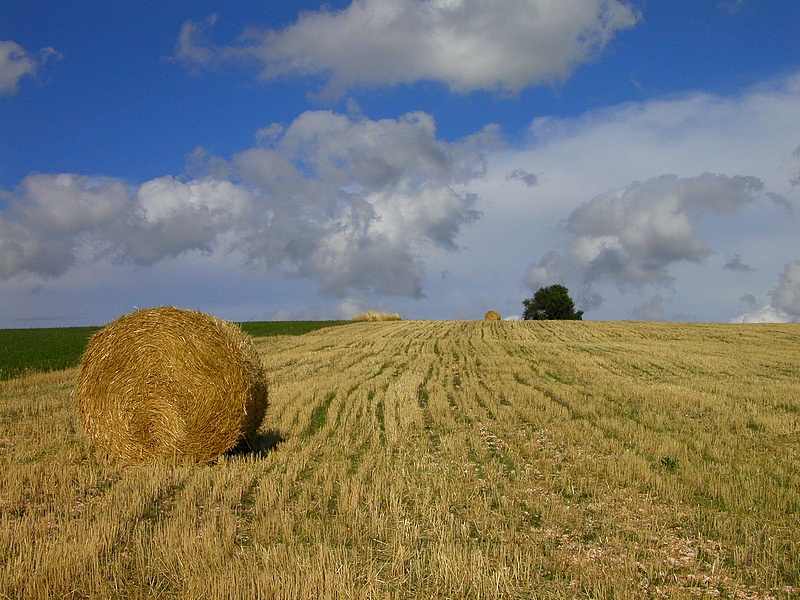 Certo che con un titolo così la foto non la presenti bene. Comunque bel cielo e bel grano ma mi infastidisce un po' l'alberello e la parte destra dell'immagine. Avrei provato a fare 3 o 4 passi verso sinistra e ricomposto l'immagine in verticale tagliando fuori l'alberino (ma di poco per non perdere la seconda balla sullo sfondo). In questo modo inoltre la prima balla stava tutta sullo sfondo giallo e l'erba verde contribuiva a rafforzare il gioco di linee.