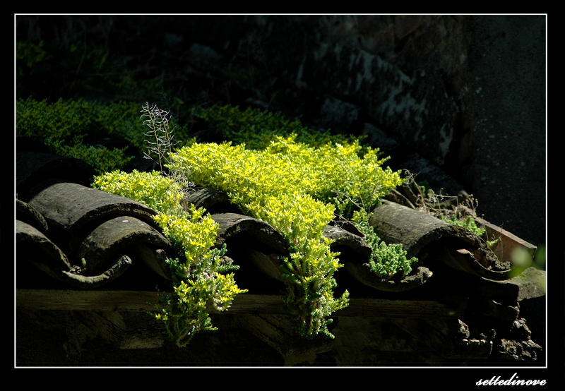 Un tetto di una casa diroccata su cui è cresciuto una specie di muschio. Il sole ha fatto il resto.