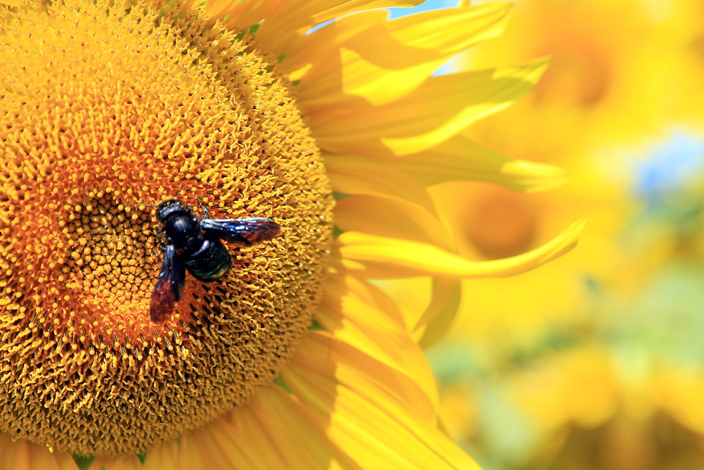 Anche se ha qualche difetto (vedi insetto un po' fuori fuoco) questa foto mi piace molto e ho voluto inserirla. Troverò l'occasione di ripassare in quel campo di girasoli per farne altre più precise.
